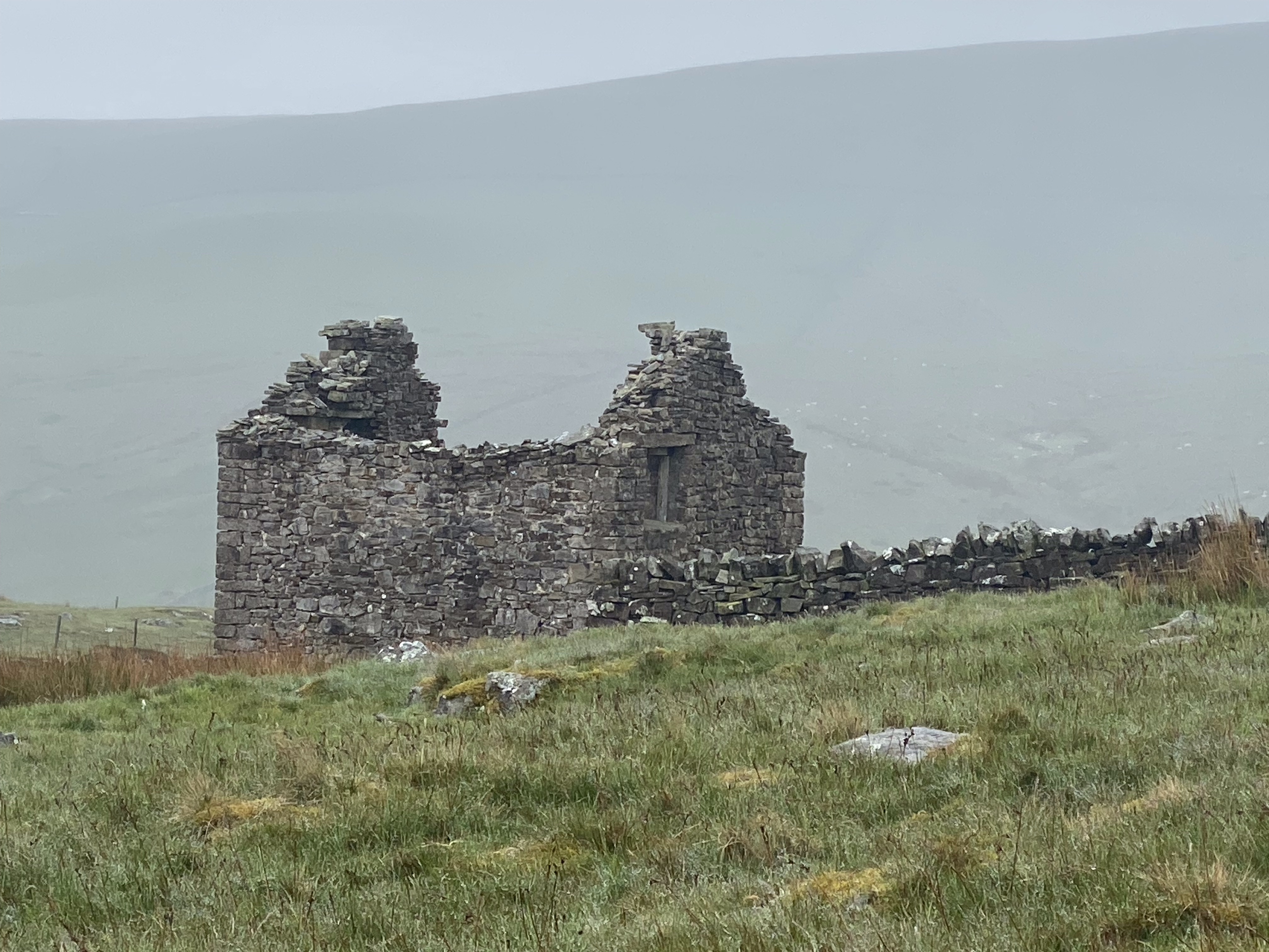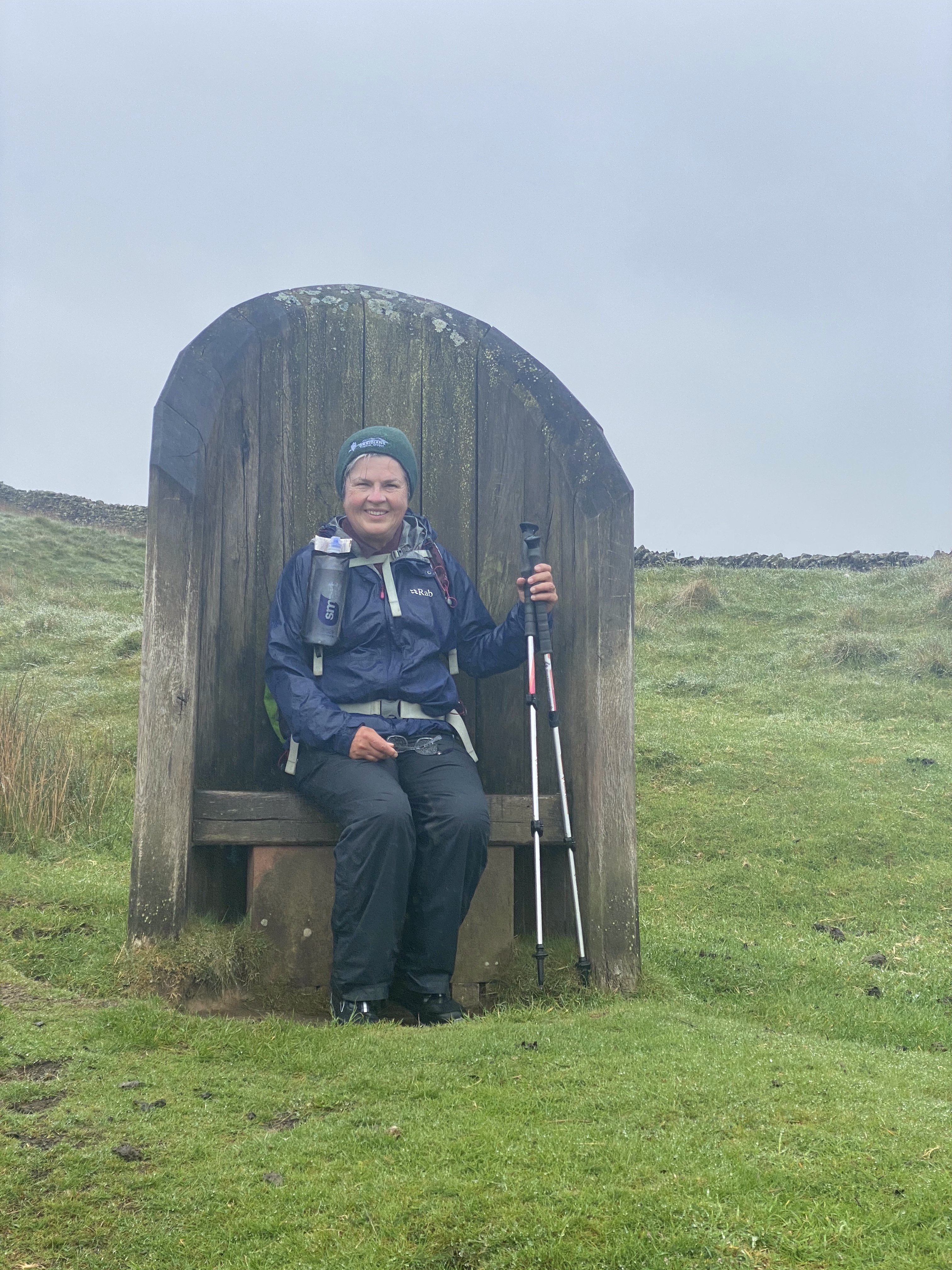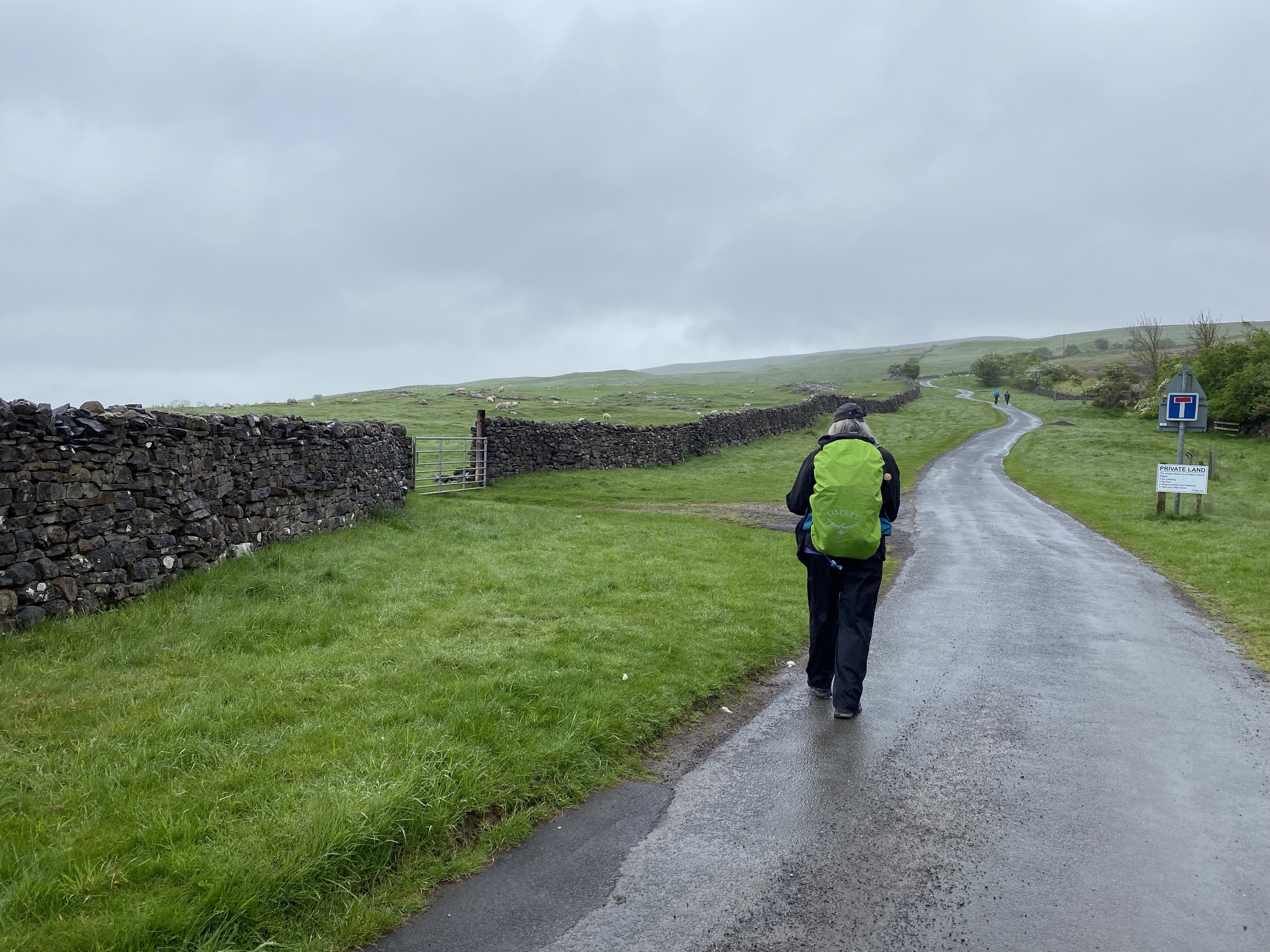 We left Fletcher House about 8:30 this morning. It was overcast and misty with rain in the forecast so I wore my rain gear from the outset. We left Kirkby Stephen and passed through a little spot called Hartley. We started climbing almost immediately. Along the way, Nancy and I discussed whether we wanted to go all the way to the top to pass by the the Nine Standards. (They are nine huge cairns that stand right along the top of a ridge that is the watershed of Britain. No one knows for sure when or why they were built but on a clear day they can be seen from miles away.) On our 2015 trip, we did go up that way but since as we neared the junction it was starting to get windier, rainier, and cooler, we decided to take the “Green Route” as suggested by the guidebook for bad weather. Of course, this is the least used route right now. Somewhere along the way we lost the trail and spent some time tromping uphill and then back down to a stone wall. I was using the OS app again and it assured us we were going in the right direction and that we would be intersecting with a trail sooner or later. We did finally reach the trail that took us down to the road.