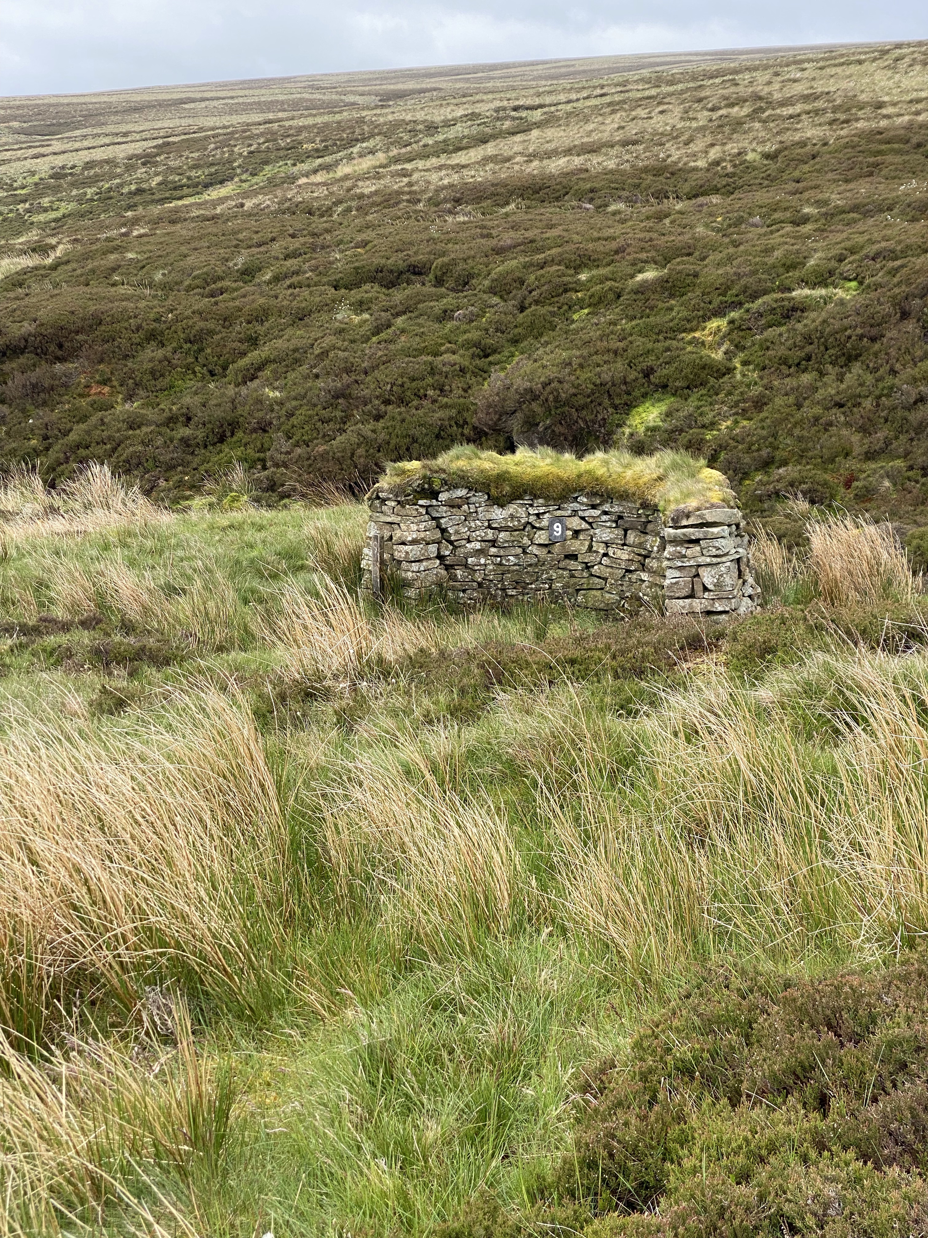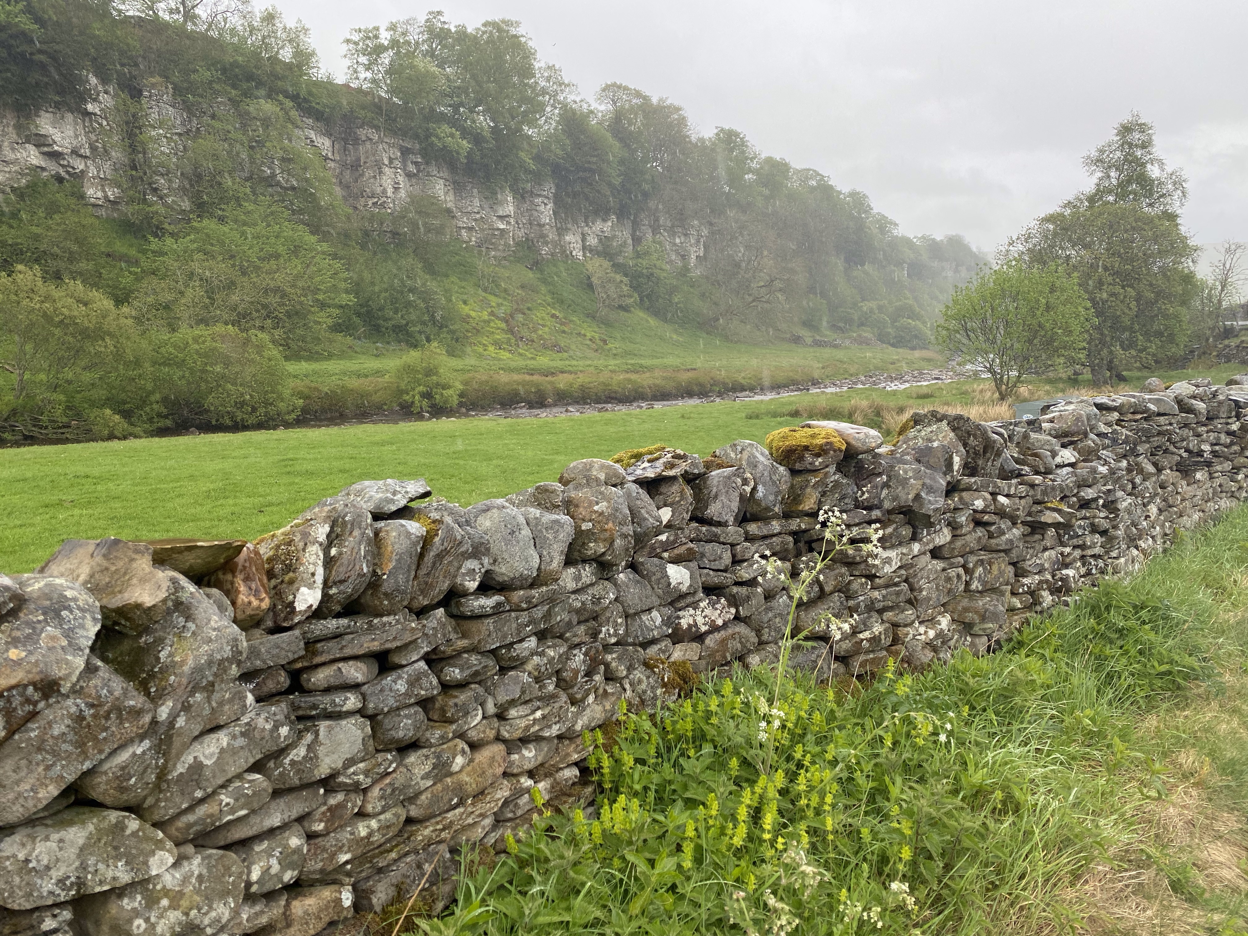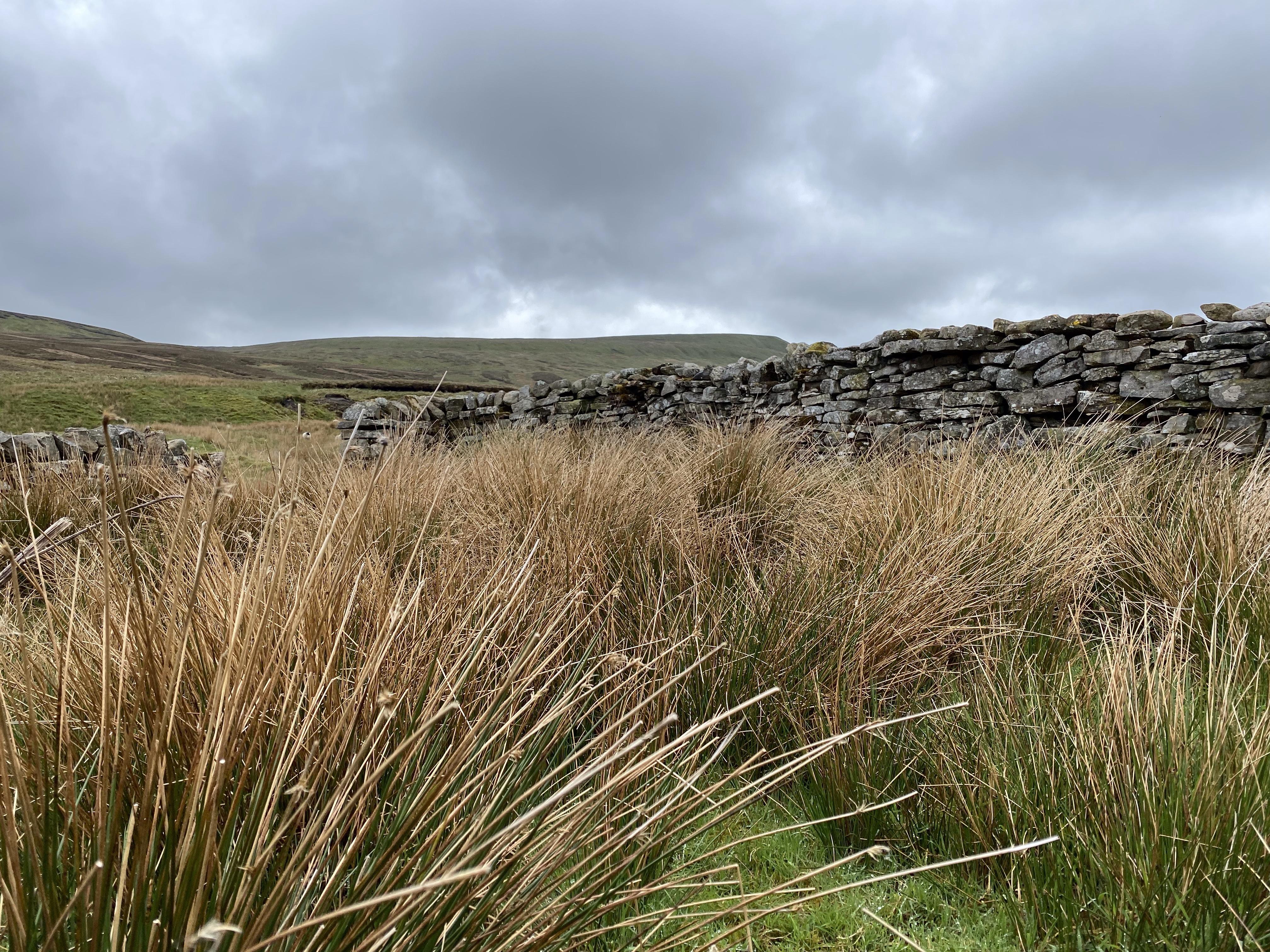 We left Fletcher House about 8:30 this morning. It was overcast and misty with rain in the forecast so I wore my rain gear from the outset. We left Kirkby Stephen and passed through a little spot called Hartley. We started climbing almost immediately. Along the way, Nancy and I discussed whether we wanted to go all the way to the top to pass by the the Nine Standards. (They are nine huge cairns that stand right along the top of a ridge that is the watershed of Britain. No one knows for sure when or why they were built but on a clear day they can be seen from miles away.) On our 2015 trip, we did go up that way but since as we neared the junction it was starting to get windier, rainier, and cooler, we decided to take the “Green Route” as suggested by the guidebook for bad weather. Of course, this is the least used route right now. Somewhere along the way we lost the trail and spent some time tromping uphill and then back down to a stone wall. I was using the OS app again and it assured us we were going in the right direction and that we would be intersecting with a trail sooner or later. We did finally reach the trail that took us down to the road.