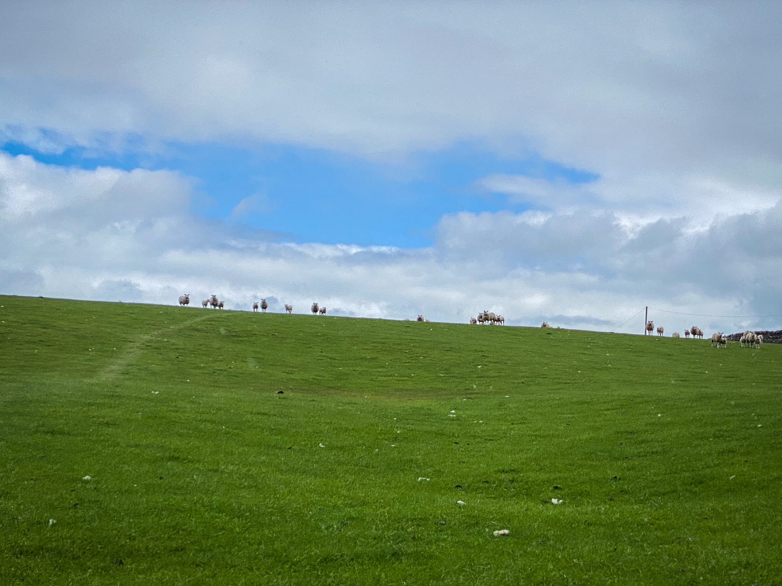 We spent most of the day leapfrogging with several people we have met before. By the afternoon they passed us a final time and we didn’t see them again. One of them is Lorraine from Canada—everyone calls her Orange Lady because she has a bright orange poncho that can be spotted from miles away. Today she was walking ahead of us when we decided to take a break in the shelter of a stone fence. We watched as she disappeared over the hill and every sheep in the field turned and hurried after her. Once they figured out she wasn’t going to feed them, they came back over the hill and they all stood in a line staring down at us for a few minutes as if to say, “What have you got for us?”