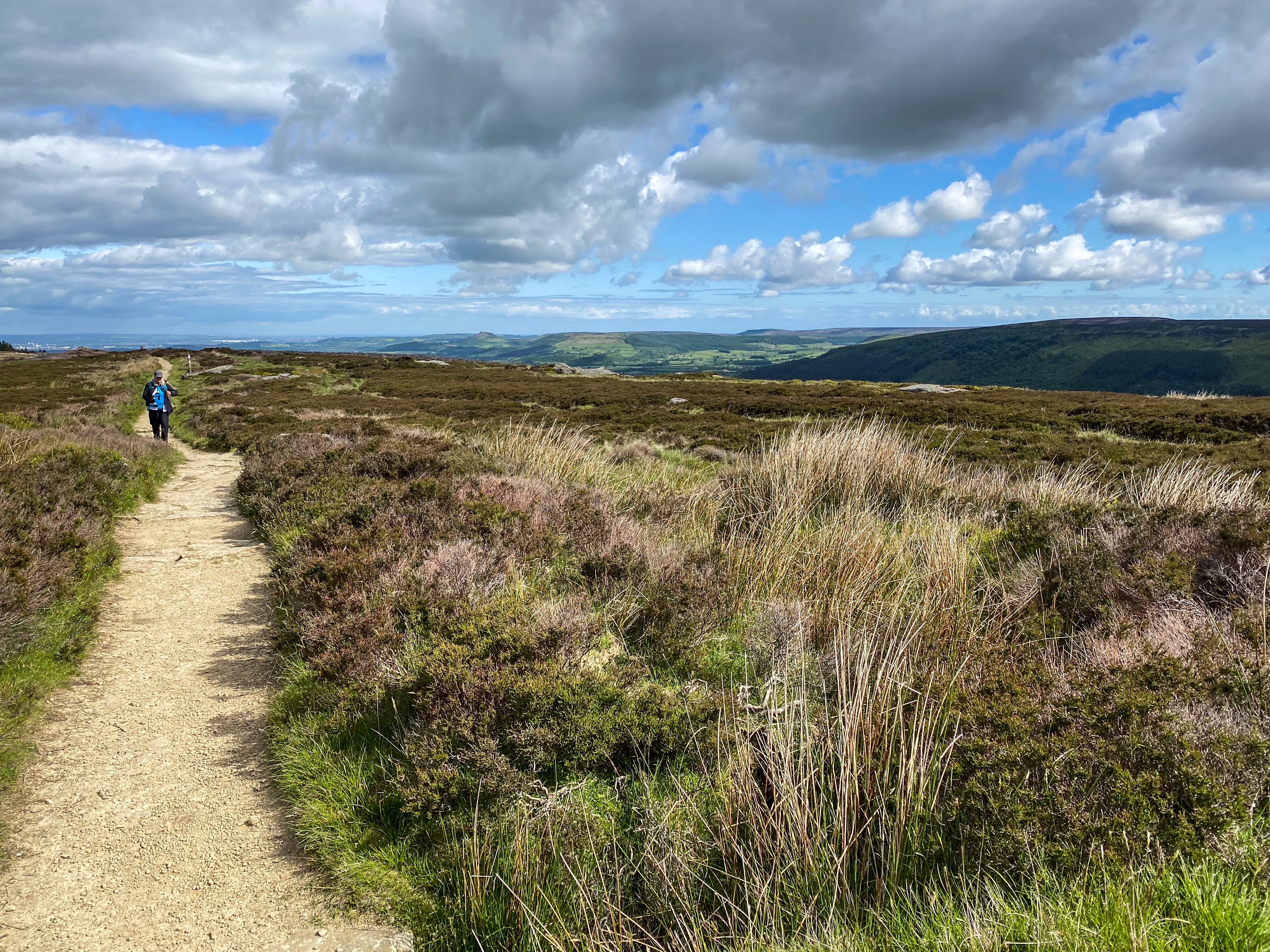 The trail itself was up steep to the top of a moor and then along the top. Part way through it follows the bed of an old, disused railway so that section was very easy walking. The last part of the day took us out to a busy road and then up the hill to the inn. They were very busy when we arrived just before two, but our rooms were ready and our bags had arrived. I ate a bit of my lunch. (I got a boxed chicken salad from the Wainstones Hotel—a welcome change from the usual sandwich!) After that I did some hand washing of some smelly clothes with the reasonable expectation that they will have time to dry by morning. The Lion Inn is amazing. It was built in the 16th century. It’s like a rabbit warren of rooms with low beams and interesting little nooks. I was going to take some pictures of the inside but when I went downstairs there were groups of people spread throughout. I’m looking forward to dinner tonight. Delicious smells are coming up to my room from below. It has been very relaxing to have such a short day.
