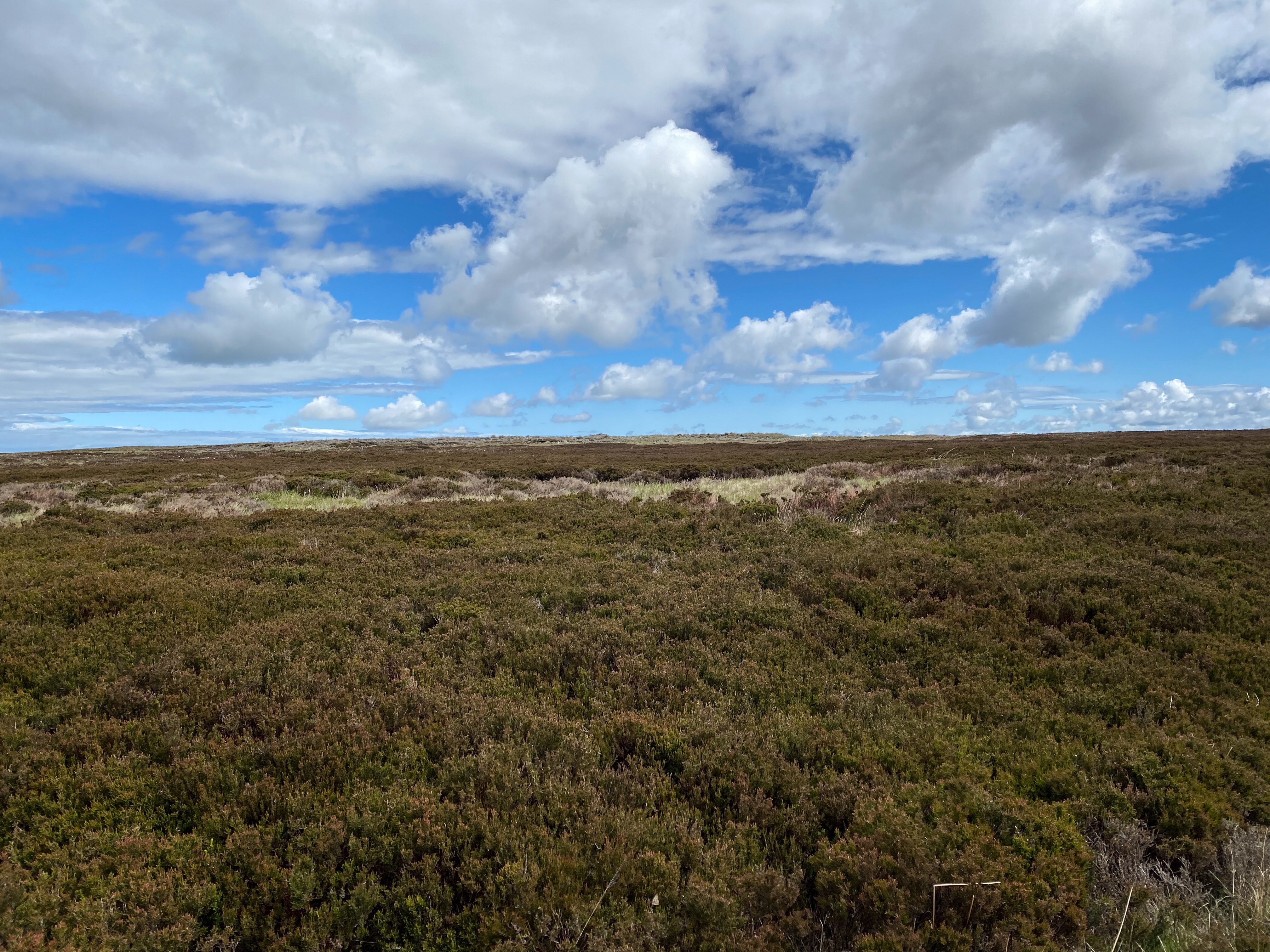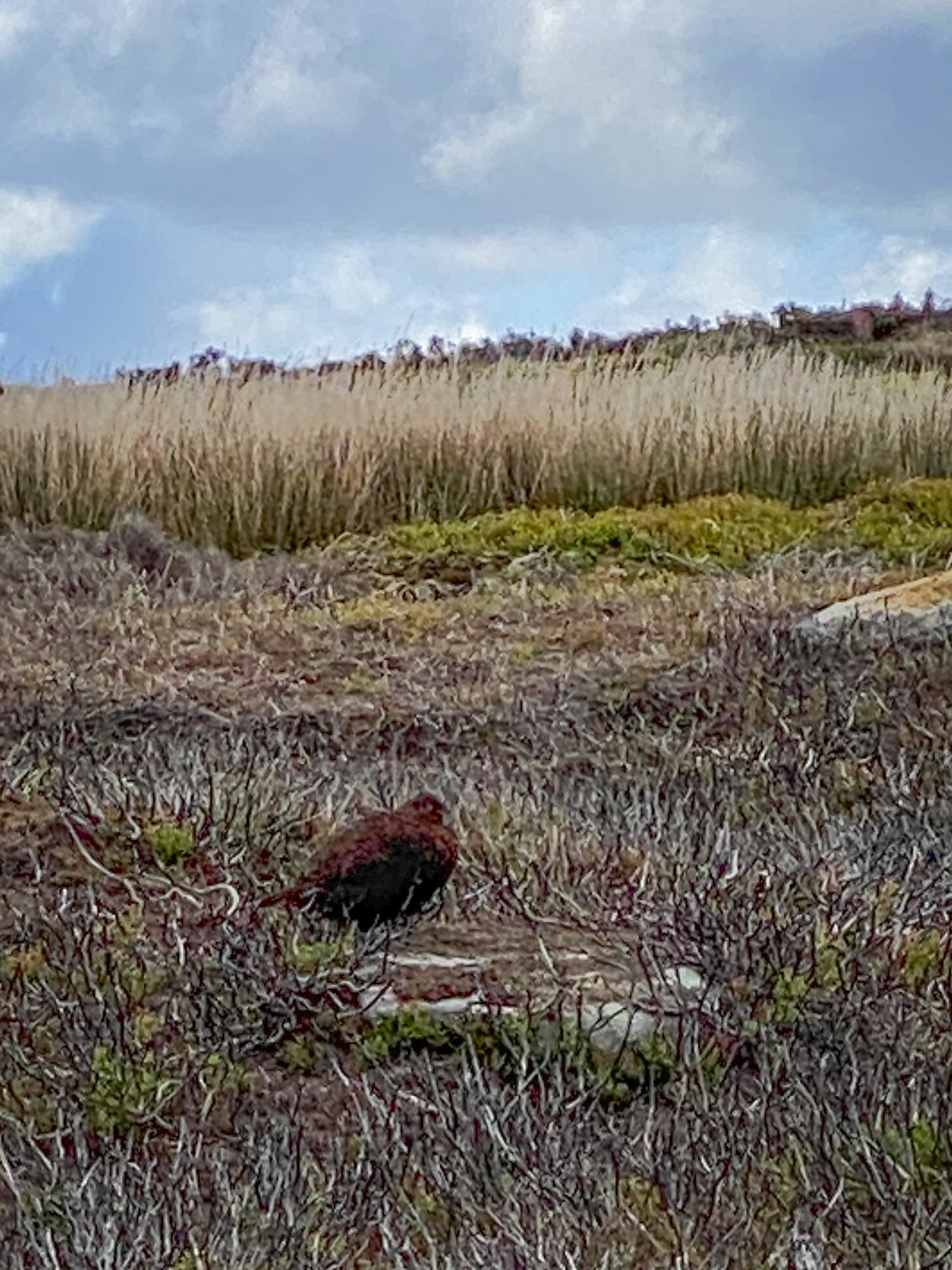 When we started we were passed by several faster walkers and then the rest of the day the only people we saw were cyclists coming or going, and even a couple groups of motorbikes. We really enjoyed the quiet of the walk today. It is nesting season on the moors and we were both excited when I spotted the first red grouse on a rock. But then as the day wore on, we were able to see even more grouse and their chicks. The chicks ranged in size from quite young to about half the size of their parent. The first chicks we saw crossed the trail in front of us. We kept a lookout for them and saw more and more. One hen had the tiniest chicks and she moved away from them and they hid as we got closer on the path. We were able to see one of them huddled down and hiding in a clump of heather. We saw so many we lost count. It was fascinating to watch them. We also saw several curlews riding the wind again today. They are so fun to watch swooping up and down and around. Their call is very interesting, too, but I don’t know how to describe it.