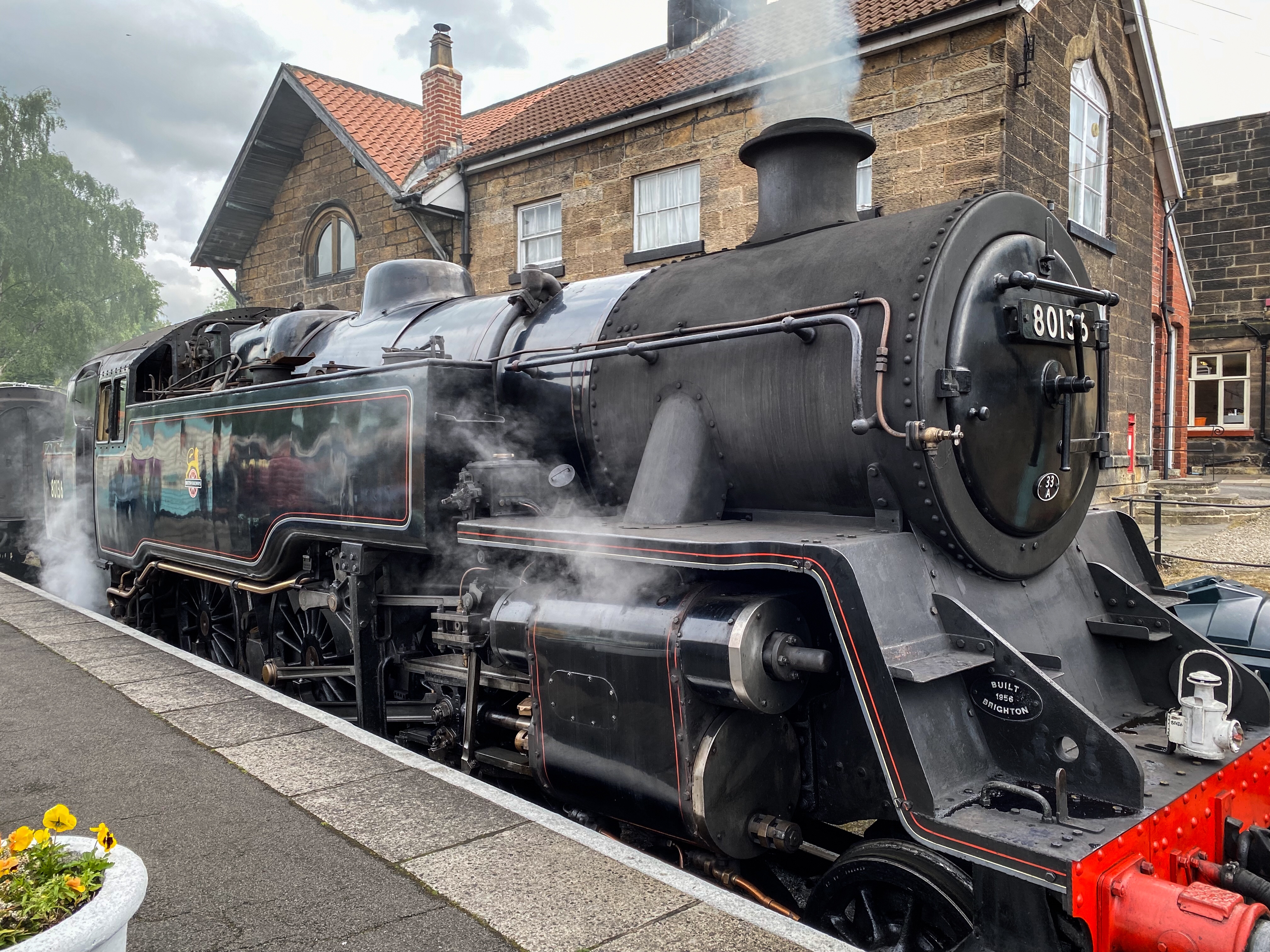 It was a short walk to Grosmont and we arrived at the perfect time. The steam engine had just arrived and we stood and took photos as they fired it back up and chugged out of the station. We thought they were gone, but they were back in just a couple of minutes as they were only changing tracks. We watched as they were shoveling coal in and hooking up the passenger cars waiting on that track. I had just positioned myself for a perfect photo without any other photographers in the way for the starting up when I noticed Nancy frantically waving at me to come. She had been talking to the conductor and we hopped on with him at the very last minute for a twenty minute ride to the next station. He sold us our ticket on the train and told us where and how to get off—we had to hustle up through the other cars towards the front. I thoroughly enjoyed the ride. I regretted not getting a picture of the clouds of steam out the window when we went through a pitch black tunnel and I could see them billowing. We were in the car right behind the engine. It was so dark in the tunnel and since the lights were off in the car, I couldn’t find my phone on the table in front of me. When we got to Goathland, we got off and waited an hour for the return to Grosmont. Sadly, that one had a diesel engine and I couldn’t get steam pictures in the tunnel. It was an excellent side trip, though, so thanks to Nancy for jumping on the opportunity! (Note to grandkids: Goathland is the train station they used for Hogsmede Station when they were filming Harry Potter and the Philosopher’s Stone. Note to David: they also used it for Heartbeat.)