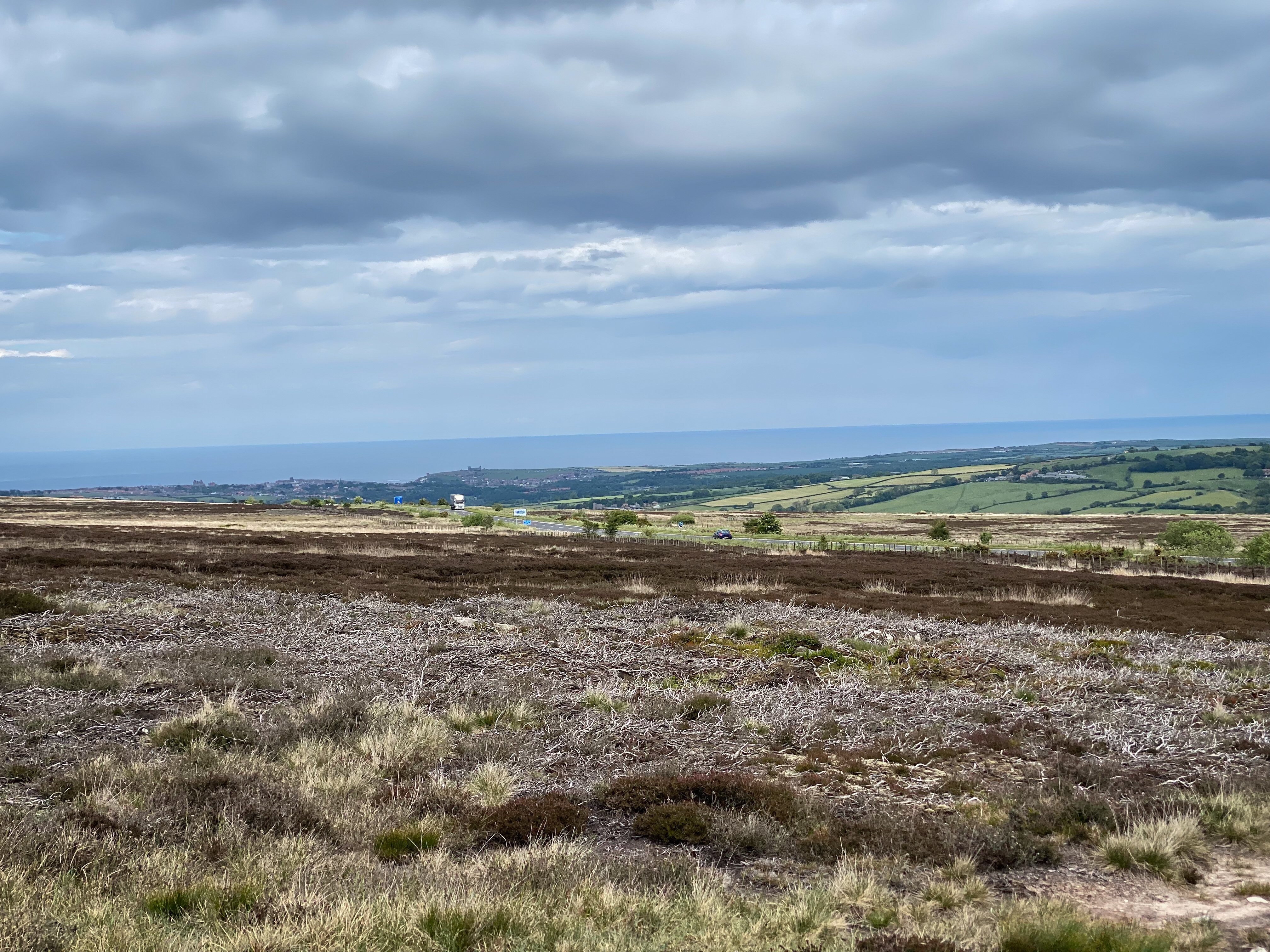 After we got back to Grosmont, we had a very steep climb out of the village for a mile. It started to rain a little (and the forecast was for rain about that time) so we stopped to put on our rain gear…and that was the last of any rain we saw while walking today. Before we made it to the top of the hill, I was steaming in my rain pants so I took them off. (At least it was a good excuse to stop on our way up that hill. I believe that is our last steep climb now.) We enjoyed the views and were excited to see the North Sea in the distance. Our goal was in sight! We were also excited to see a herd of deer on a hill. There was a deer fence around them and I was thinking how cool it would be to have your own herd of deer. Then as we were sitting on a bench near the top of the hill, a farmer stopped right by us to check on his sheep. Nancy asked about the deer and I was rather deflated to realize they are just raising them for the meat. (I should have guessed; venison is on all the menus around here.)