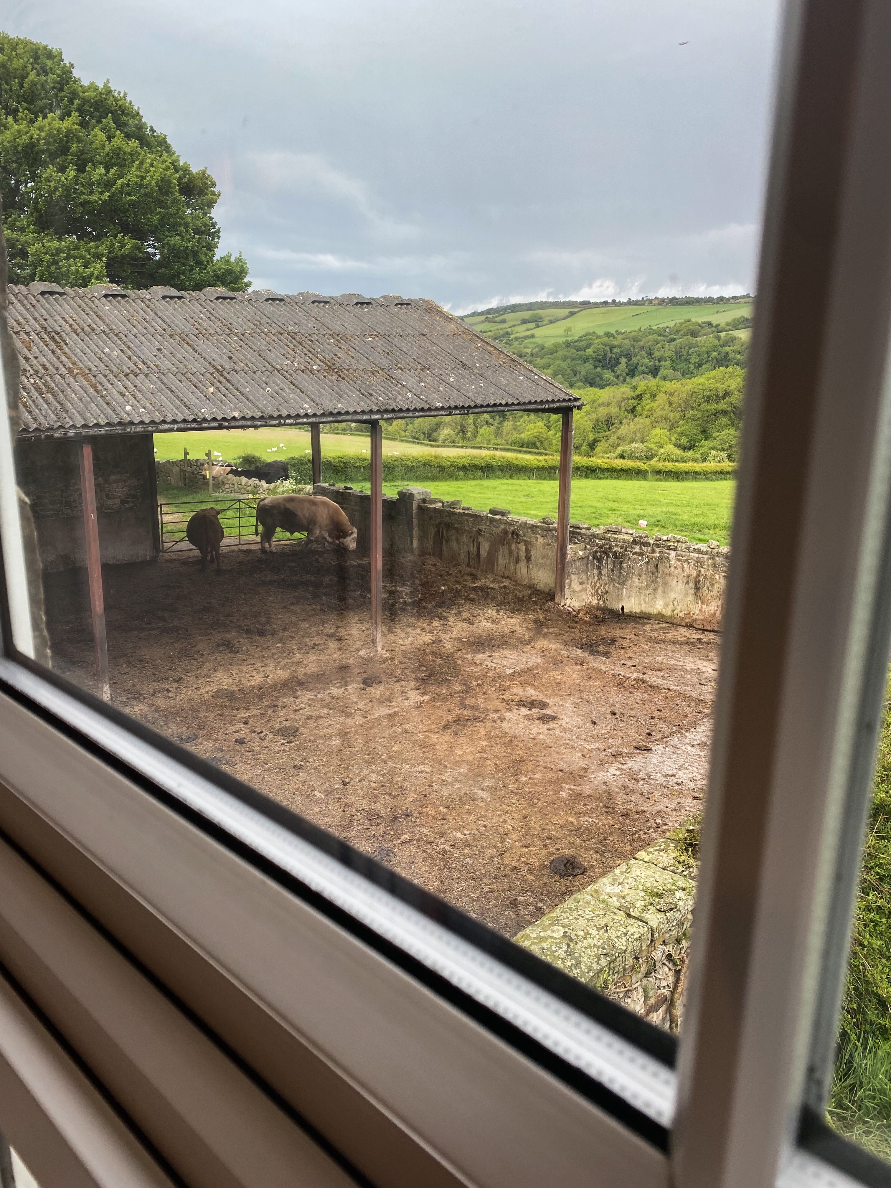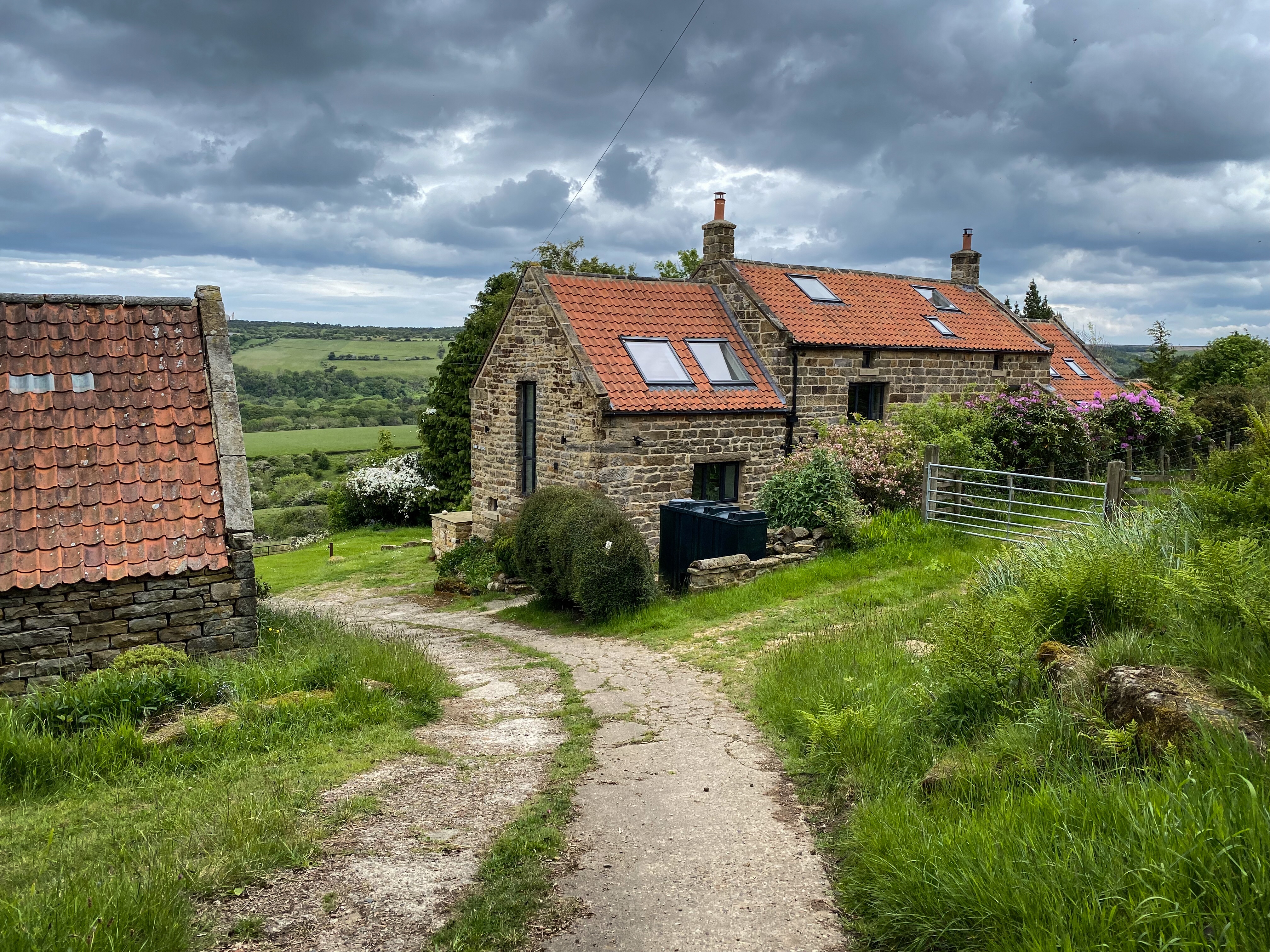 After we reached the top of that hill, we were back on a moor. We crossed over it, went down to a busy road, and before we reached Littlebeck, left the C2C route and followed a track into farmland again. (It is so strange to walk through someone’s farm and right in front of their house on what you would think would be their front yard.) The last part of our walk was through a field of sheep running for the hills, a pasture with cows and calves (you should have seen us walk through there like farmers), and through a barnyard. We ended up at Intake Farm. It is obviously a working farm besides being a B&B. They also have walkers camp here and feed them dinner as well. Our host gave us tea and cake in her kitchen as she and her niece were preparing a delicious home cooked dinner. After tea Nancy and I went upstairs to settle in; I had the best shower of this whole trip!