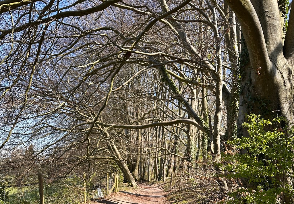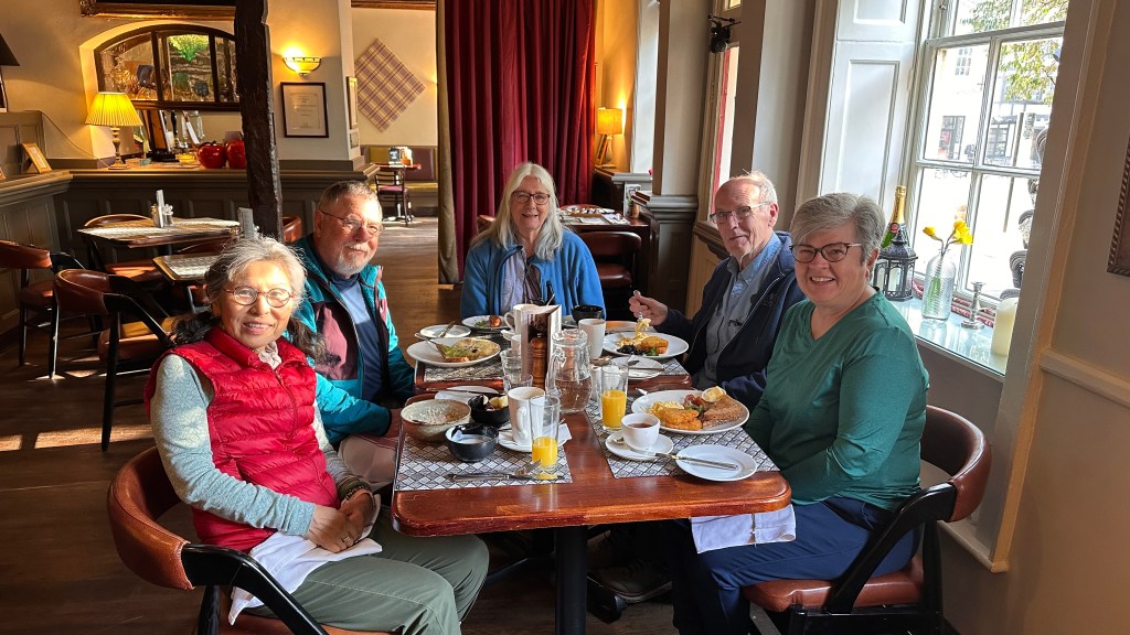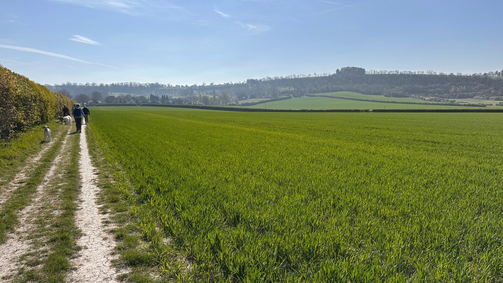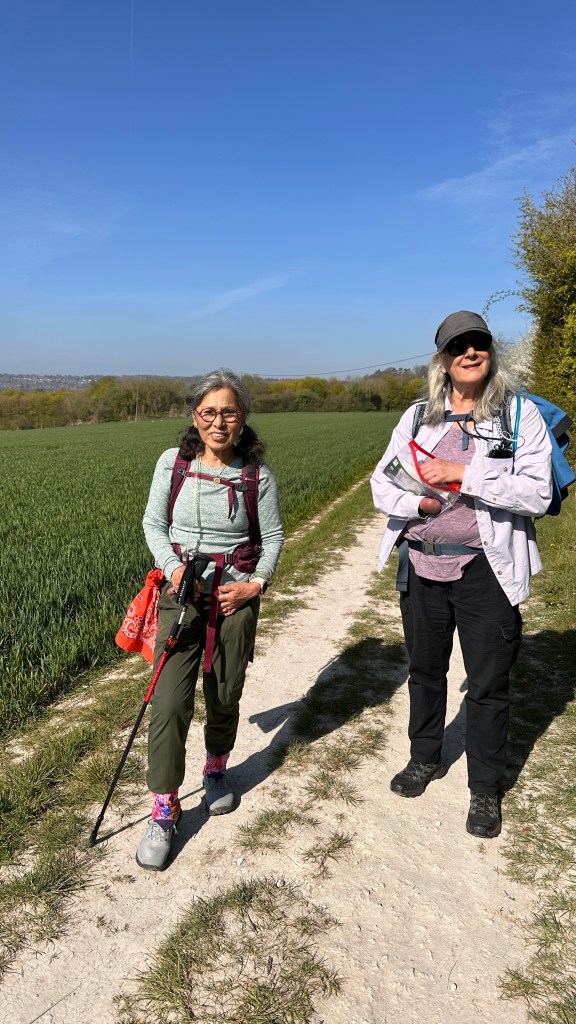 We met for breakfast at 8 am in Winchester and were sitting down for dinner at 6 pm in Meonstoke. In between were 14.75 miles (Not the twelve miles stated by Mickledore and our guidebook!) and many hills, expansive views, birds, butterflies, and blooming flowers! The climbing today actually was never that bad, but the temperature did get up to almost 70 around noon. We ate our lunch in the shade of a tree on the path then just a few miles later stopped for cold drinks at a former dairy farm that is now catering to walkers, cyclists, and campers on the trail. Their facilities were just excellent with a little snack bar, toilets and showers, picnic tables and green grass everywhere. The last miles of our trip today seemed very long, and we arrived at the Bucks Head very tired!