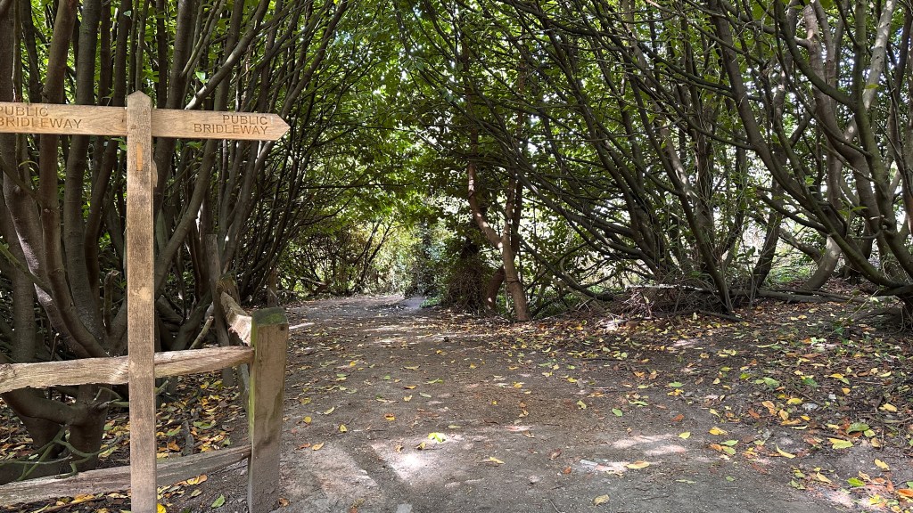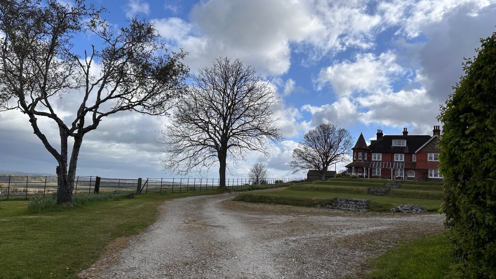 After we got back on the trail, June and John were soon out of sight. The trail was the same as it has been—lots of ups and downs. David really struggled on this part. Whereas in the morning there were several spots he could have stopped and been met by a taxi, the afternoon route had no such places. As we neared the last part of this leg, Nancy studied the map looking for shorter alternatives to get to Bramber. Between the two of us we found a few possibles but passed on them until finally we got to one that had a gentler descent and a nice wide, flat trail surface. We took that and again were glad of our choice. It was a good trail that turned into a lane, went straight through a stableyard, and on to Bramber and best of all, out of the wind.