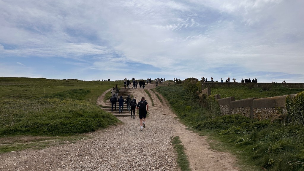 It was cloudy and windy again, but there was just enough sunshine to really show off the white of the cliffs. I stopped to take so many pictures! The steepness on this part didn’t even bother me. After the last cliff, the trail descends to sea level at Birling Gap—a landing place for smugglers back in the smuggling times. The closer we got to Birling Gap, the more people we began to see. The place was teeming with people when we got there. We had two long waits in line at the toilets and in the cafe, but I managed to snag a table just as we walked in the door of the cafe, so we were able to eat our lunch in out of the wind and cold.