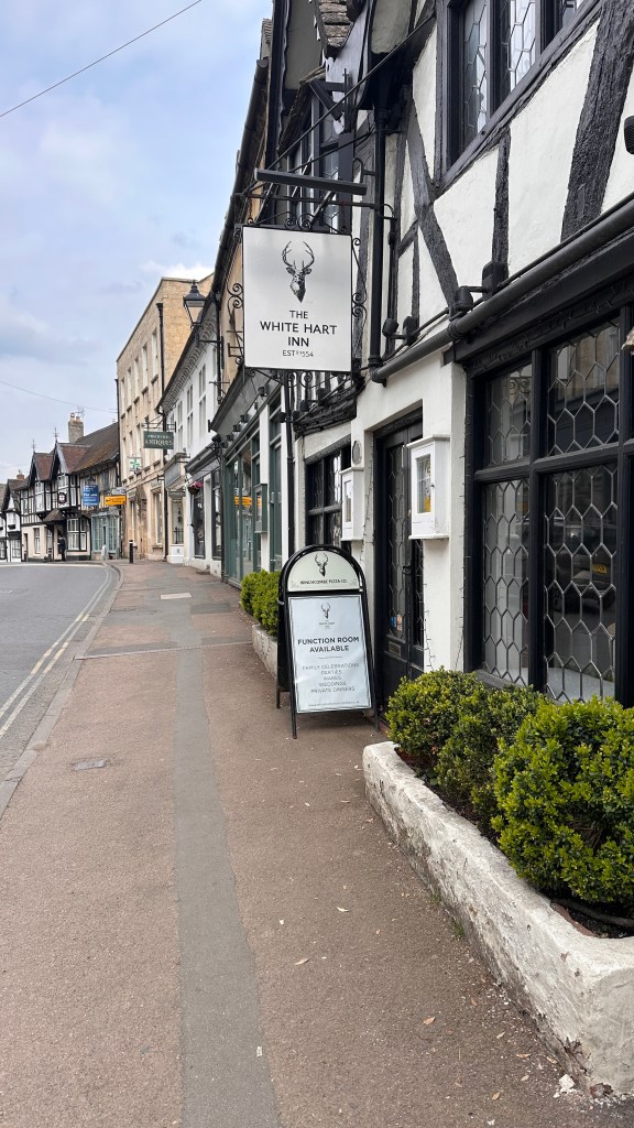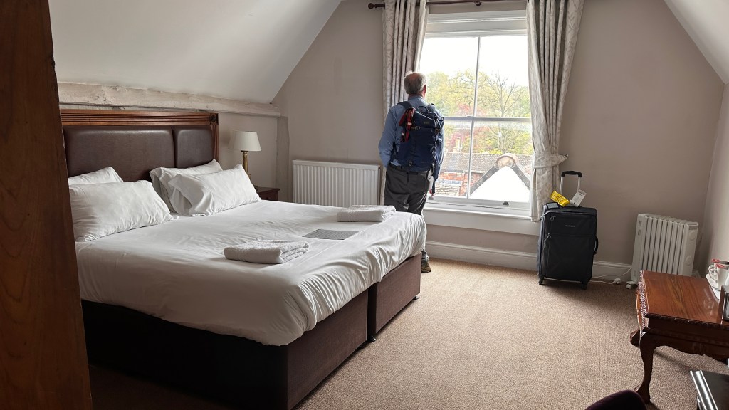 We are staying at the White Hart. It is an older building, but our room is quite large and comfortable. The plumbing makes strange noises but other than that, we have no complaints! The bed is very comfy after this short-walking, but tiring day.