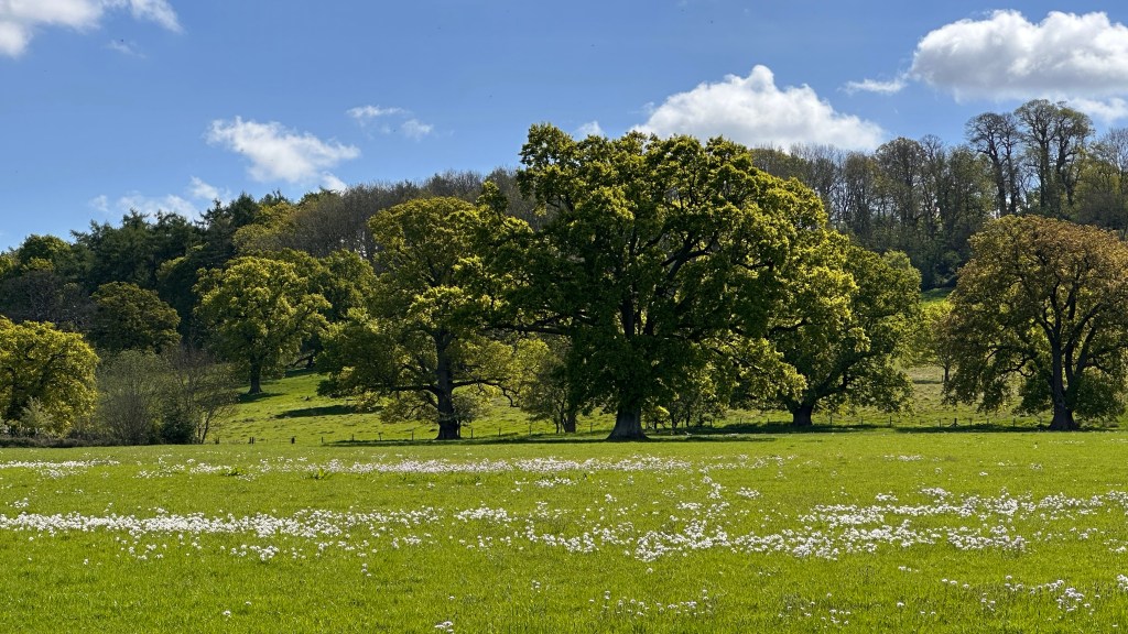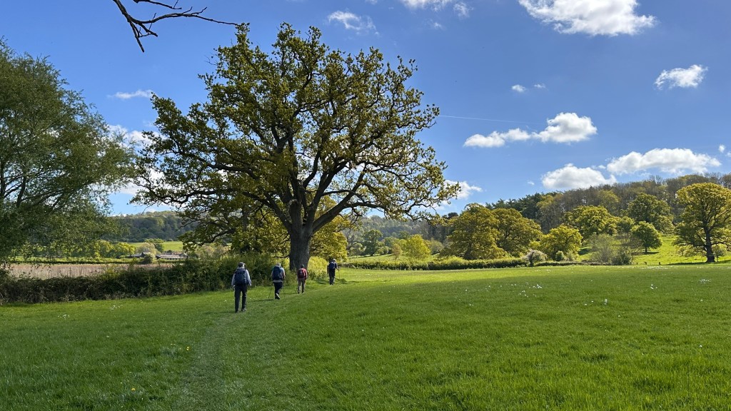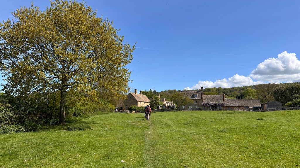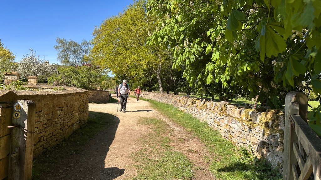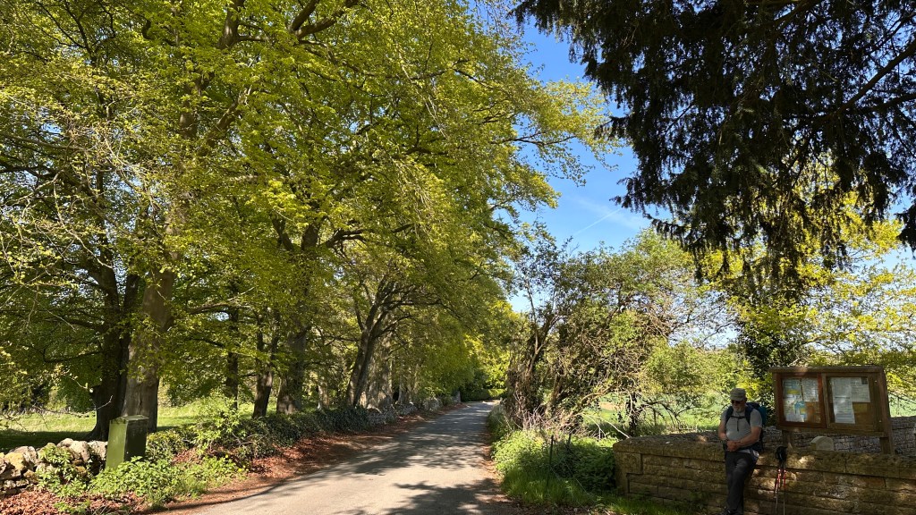 It was an absolutely gorgeous day. As we left Winchcombe behind, the church bells were chiming, the birds were singing, and occasionally we could hear the whistle of a steam engine on an excursion train. It made a beautiful melody. The trees were magnificent and I wanted to take a photo every few hundred feet. At two miles, we had planned to stop at Hailes Abbey; we were disappointed, though, to see the sign stating they were only open for pre-booked tours. David and I stopped here in 2017 and were able to tour the grounds and visit their excellent museum. It’s was such a memorable stop, I was looking forward to sharing it with Nancy, June, and John. We couldn’t even see the ruins from the road. We moved on, and parts of the road became more familiar to me as we followed the Cotswold Way through Stanway and on to Stanton.