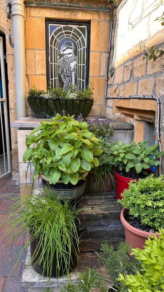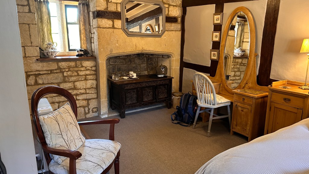 Our hosts were still not in when we rang the bell at 4:00, but a friend close-by who watches for guests came and let us in to the back garden and gave our host a call. (She was still out because she thought we were walking all the way from Winchcombe and wouldn’t arrive until later.) We sat in the back garden surrounded by plants in pots and she soon was there. This is one of the nicest places we have stayed in. Big rooms and very comfortable! We are happy to be spending two nights here.